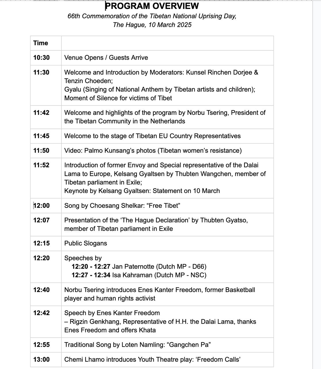 Accueil / Actualités / LA HAYE / PROGRAM OVERVIEW 10 mars 2025 : 66th COMMEMORATION OF THE TIBETAN NATIONAL UPRISING DAY