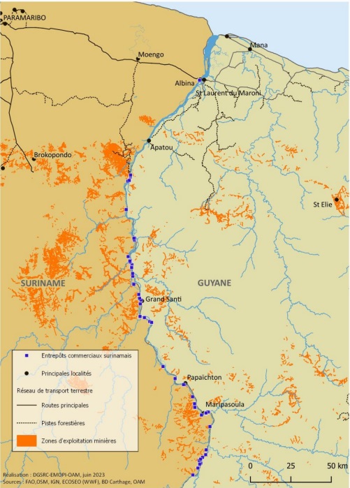 Au sein du croissant aurifère guyanais, la « façade Ouest » regroupe l’immense majorité des sites d’orpaillage illégal. Près de 80 % des chantiers alluvionnaires y sont implantés. Pour la plupart, ces activités se situent à quelques dizaines de kilomètres du fleuve Maroni. Affectés par une grande porosité de la frontière entre le département français et le Suriname, le cours d’eau et ses abords sont devenus une artère cruciale de la logistique.