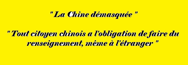 Ce numéro spécial, n° 157 : « Les dossiers du Canard » d’octobre 2020, nous rafraîchit la mémoire à ce sujet. En effet nous pouvons lire page 106 : La loi sur le renseignement national –guojia qingbao fa – adoptée en 2017 par l’Assemblée Populaire Nationale enjoint :