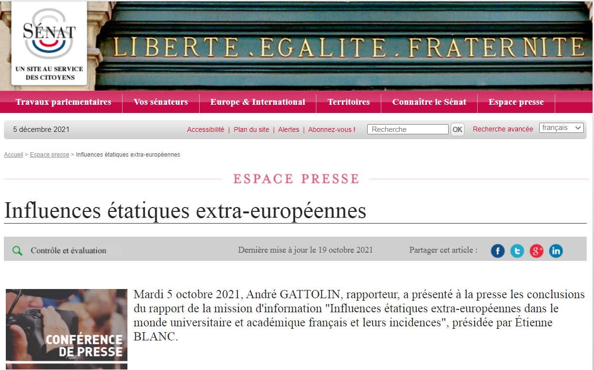 A l’heure où le Parti communiste chinois vient de renforcer le pouvoir du président Xi Jinping, il règne en France une certaine inquiétude quant aux tentatives d’ingérence de l' »empire du milieu » dans son enseignement supérieur. Le 8 octobre dernier, le rapport « Les influences étatiques extra-européennes dans le monde universitaire et académique français et leurs incidences », fruit d’une mission d’information parlementaire dirigée par le sénateur André Gattolin, membre du groupe LREM du Sénat, a été publié.