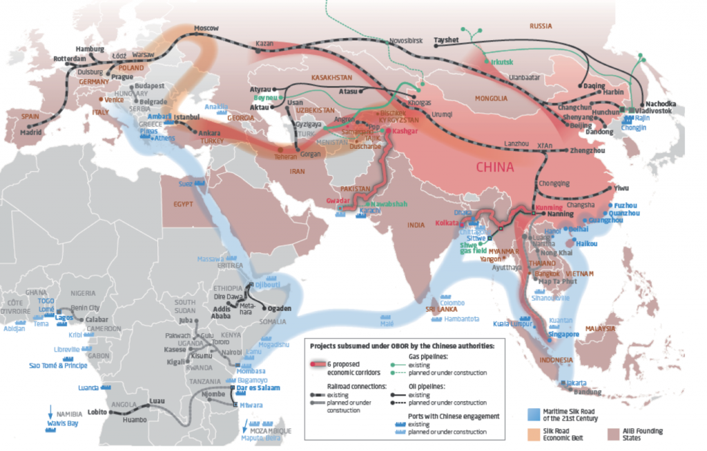 L’Initiative « Belt and Road » chinoise. Source : Mercator Institute for China Studies, merics.org[/caption]