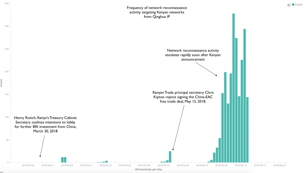 Le graphique ci-dessous montre une nette augmentation des activités de reconnaissance du réseau contre les organisations kényanes issues de l’IP de Tsinghua. Ce pic a eu lieu deux semaines à peine après l’annonce par le Kenya de son intention de ne pas soutenir l’accord de libre-échange Chine-EAC :