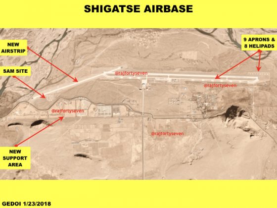L’aéroport de Shigatse a récemment été converti en base aérienne, le rendant inaccessible aux vols civils. La construction d’une piste d’atterrissage supplémentaire est en cours à l’ouest de la piste principales, certainement à l’usage des UAV.